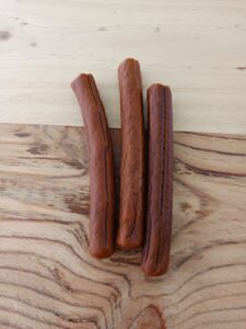 La slachicha de conejo es un snack natural y saludable, hecho principalmente de carne magra de conejo (97 %), complementada solo por tapioca (3 %), sin conservantes ni colorantes. Son mono-proteicos y perfectos para perros con alergias o sensibilidades alimentarias.