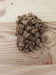 Los Cubos de Salmón 100 g son un snack natural elaborado con 100 % salmón de alta calidad, deshidratado con cuidado para preservar su sabor y propiedades nutricionales. Gracias a su fórmula simple, son una fuente excelente de proteína (70 % aprox.) y omega-3, esenciales para una piel brillante, pelaje saludable y bienestar cardiovascular.