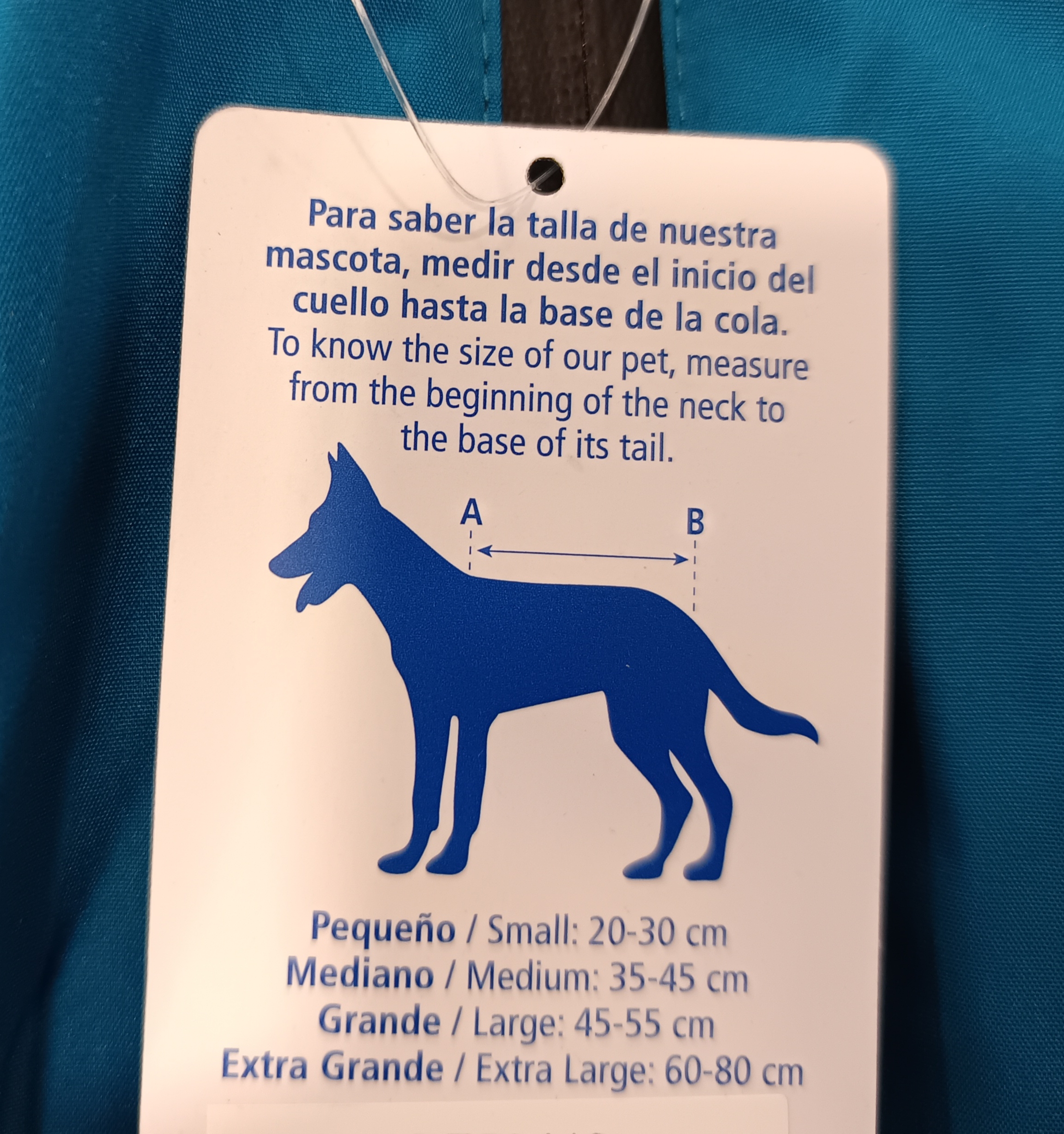 Cada talla está medida en centímetros desde la base del cuello hasta la base de la cola. Por ejemplo, la talla de 50 cm corresponde a un largo de espalda de 50 cm.